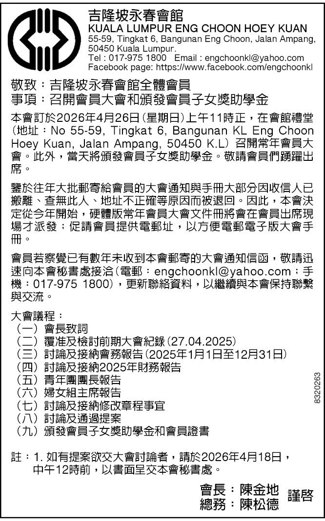 本会新春团拜活动免费开放给所有会员参与,欢迎携带家眷一同赴会。任何询问,可联络秘书处 (电话:03-20703188;电邮:[email protected])。吉隆坡永春会馆地址为:No. 55-59, 6th Floor, Bangunan Eng Choon, 50450 Jalan Ampang, Kuala Lumpur. 若乘搭轻快铁,可在敦霹雳路Masjid Jamek站下车。